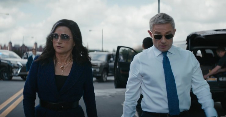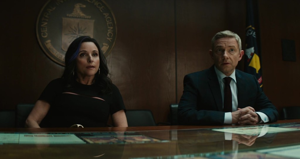 At this point in the world, forces are making their moves, and Earth is without a team to defend it, so the CIA, under the direction of Contessa Valentina Allegra de Fontaine (Julia Louis-Dreyfus), has been making moves of her own. She is gathering people to form her own team, and with her desire to get her hands on Vibranium, one can only imagine what she would do with it. Through her, we also learn more about Everett K. Ross (Martin Freeman), who has been slipping information to Wakanda under cover of darkness since they saved his life and spine. Valentina proves her cunning and awareness and uses her ex-husband towards her own ends. As Wakanda works to exist in a world that is seeking all of their secrets, and that which makes them a prosperous nation in what many around the world viewed as little more than a backwater country until recently, their government struggles to unite until they are driven into a corner by Talokan. Old issues rear their heads and alliances shift like the sand beneath the waves, honing in on the weaknesses as much as the strengths of each respective country – the United States, Wakanda, and Talokan.