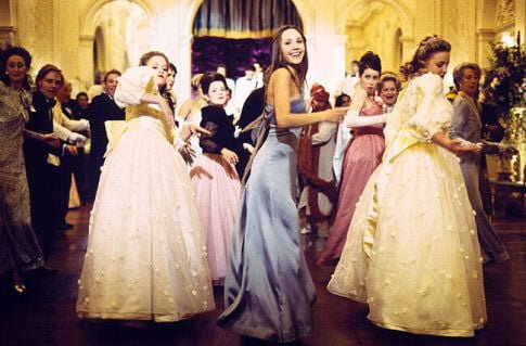 As villains, though, Alistair, Jocelyn, and Clarissa represent varying levels of threats, and if this were a darker film, Alistair would have truly been the most threatening figure circling around Daphne. As a lighthearted romcom, Alistair obviously doesn’t try to have Daphne killed; he simply tries to remove her from the equation by showing Henry how ill-suited she is for the world he moves in. On the other hand, Clarissa is, at best, a nuisance. She sabotages Daphne by misconstruing how certain events need to be dressed for and spreads nasty comments about Daphne to those around her, but at no point does Daphne take the threat she represents as something serious. Jocelyn turns out to be the one who causes the most damage when, during Daphne’s debutant ball, she locks Daphne into a room and has Clarissa participate in the father-daughter dance. This dance is a reoccurring plot point, something that Daphne feels she has missed out on throughout her entire life, made all the worse because her mother performs live music for weddings and Daphne works as a cater waiter, longingly watching the bride and her father dance at each one.