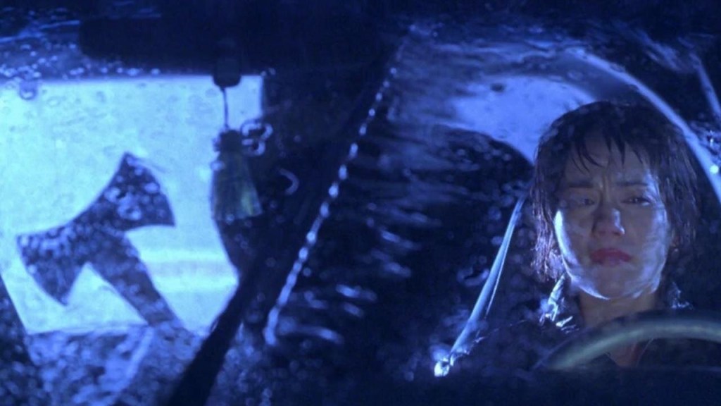 We begin by with the introduction of a young woman, Michelle Mancini (Natasha Gregson Wagner), who is driving alone along a dark, isolated road far from the city when she realizes she has to get gas. What begins as a fun, energetic scene of a woman enjoying music while taking a nighttime drive turns into a harrowing situation. An older, creepy gas station attendant convinces her that she must leave her car to pay, only for her to hurry back when he can’t stutter his way through his explanation. By then, it’s too late. A figure is in the back seat, and with a single swing of their axe, Michelle becomes the opening victim to a long slew of re-enactment murders.