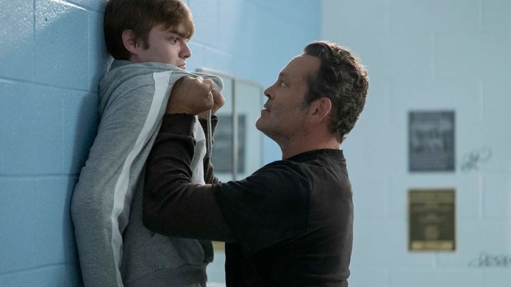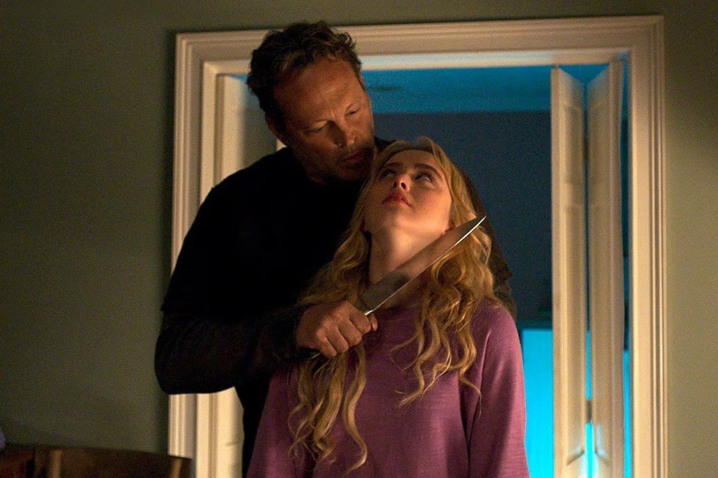 But then the twist happens, and you have to focus on what did occur during the film’s theatrical opening slash-fest. Freaky opens like most slasher films do, giving us a group of teens engaged in sex, drugs, and other debauchery while alone in a big house – only to see one or all of them die in excessively gory manners. It’s after the murderer, the Blissfield Butcher (Vince Vaughn), dispatches the last of these teens, and he grabs a trophy on his way out – an ancient dagger known as La Dola. This dagger is his weapon of choice when he stalks Millie, intending to make her his next victim. While Millie waits alone, the Blissfield Butcher chases her to the football field, where he then stabs her in the shoulder, causing an identical wound to appear on him.