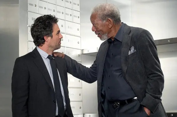 How the first trick is accomplished becomes the driving question for FBI Agent Dylan Rhodes (Mark Ruffalo) and Alma Dray (Mélanie Laurent), an Interpol Detective. The Horsemen are funded by Arthur Tressler (Michael Caine), an insurance magnate, who seems heavily invested in their success because it would serve to make him quite a bit of money. The final major member of the ensemble is Thaddeus Bradley (Morgan Freeman), a former magician who has spent decades exposing the magic acts of other magicians and seems determined to prove how the Horsemen were able to pull off their trick. While their goals are similar, they are interdependent on one another for a portion of the film; if Bradley succeeds first, the FBI and Interpol get the answers they need to solve the crime, if Rhodes and Dray succeed. Bradley gets the Horsemen in a controlled setting. The thing is, their goals are similar, but they are not the same.